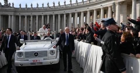 Francisco, que percorreu a Praça de São Pedro em carro aberto, saudando a multidão, explicou que, devido aos problemas respiratórios que o têm afetado nas últimas semanas, confiaria a leitura da catequese a um colaborador.