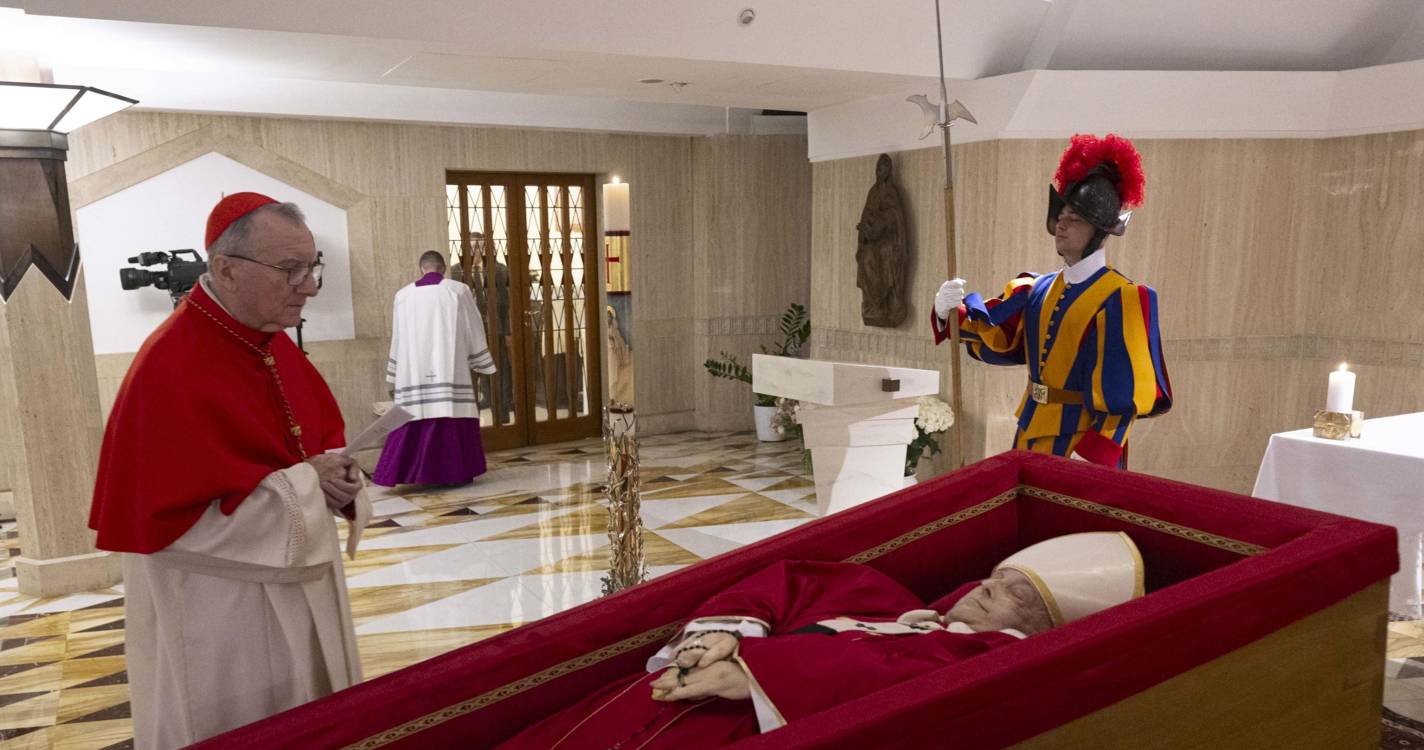 O Vaticano divulgou hoje as primeiras imagens do Papa no caixão aberto, ladeado por dois guardas suíços na capela da Residência Santa Marta, onde Francisco vivia.